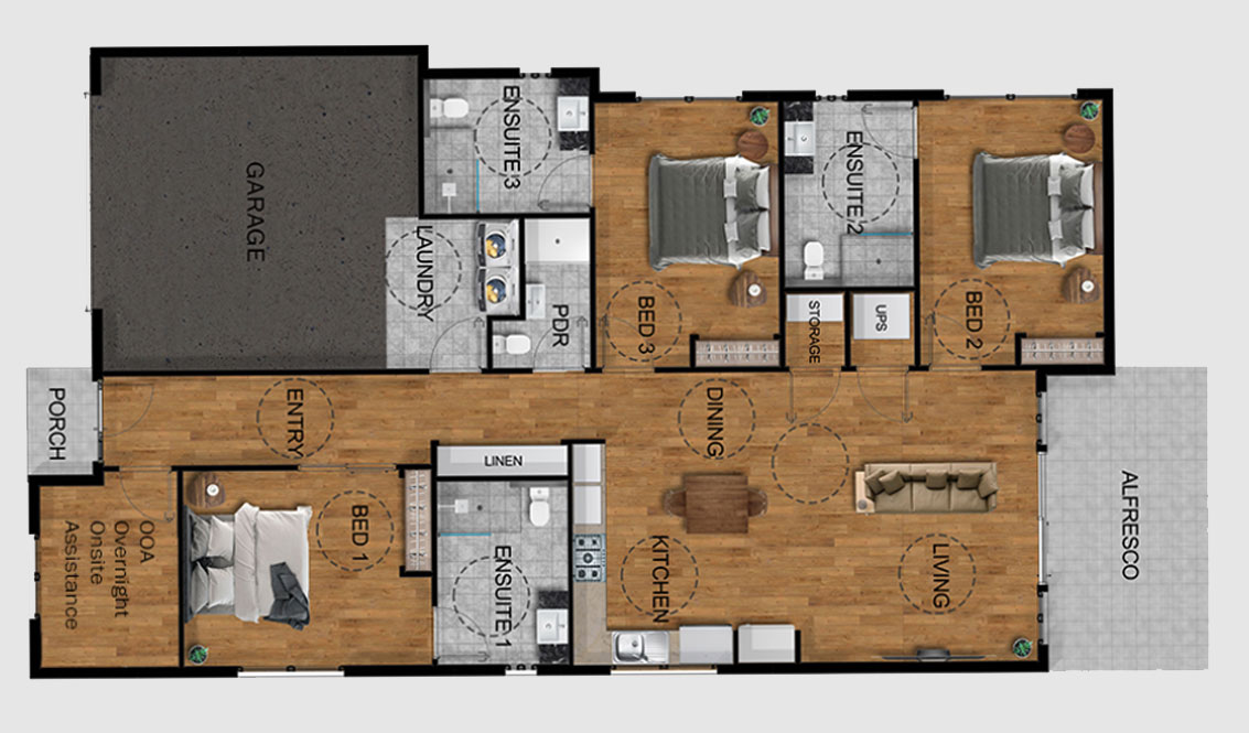 High Physical support 4 bedroom homes 3 Participates plus OOA all Participants rooms ensuites with all modern facilities open plan kitchen, living and and dining area with nice backyard. SIL service in place. Every room got own outdoor garden area. Big block of land with big size bedrooms and living areas.